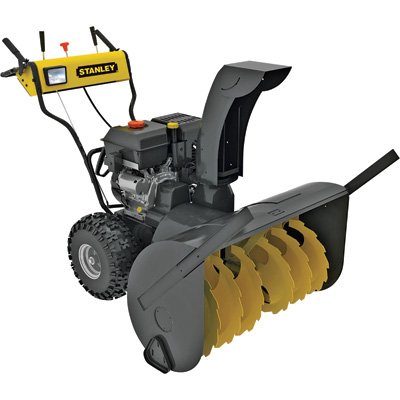 This electric start Stanley Snow Blower reduces snowbanks into sidewalks in a single pass. 16in. serrated solid steel augers and a powerful engine pull snow in and throw it up to 40 ft. away. 6 forward speeds. Great for landscapers, large lot owners, clubs, groundskeepers and parks. HP: 15, Engine Displacement (cc): 420, Gross Torque: 25 1/2 ft.-lbs., Stage: Two, Start Type: Electric, Forward Speeds: 6, Reverse Speeds: 2, Clearing Width (in.): 36, Intake Height (in.): 23, Throw Distance (ft.): 40, Discharge Chute Material: Steel, Discharge Chute Rotation (deg.): 180, Impeller Size (in.): 23, Tire Size (in.): 16, Headlight: Yes